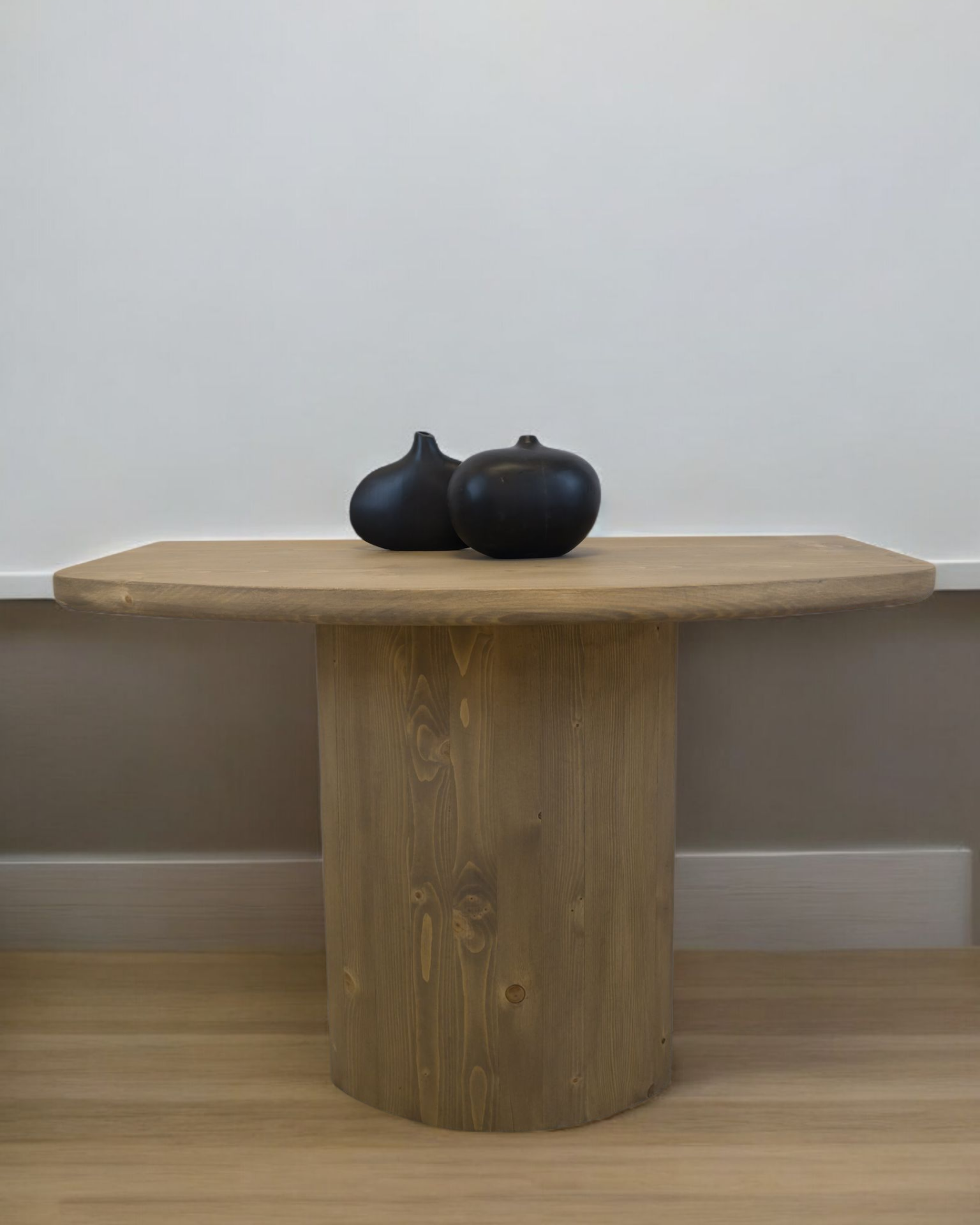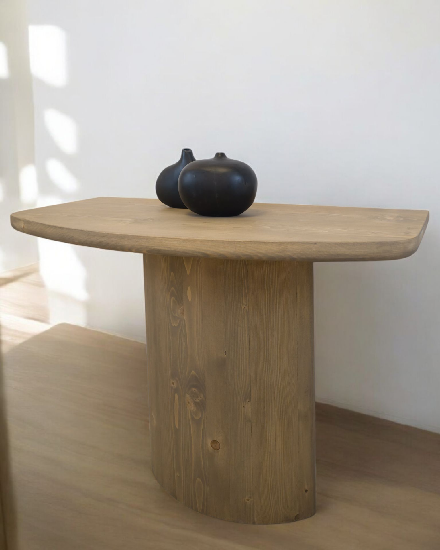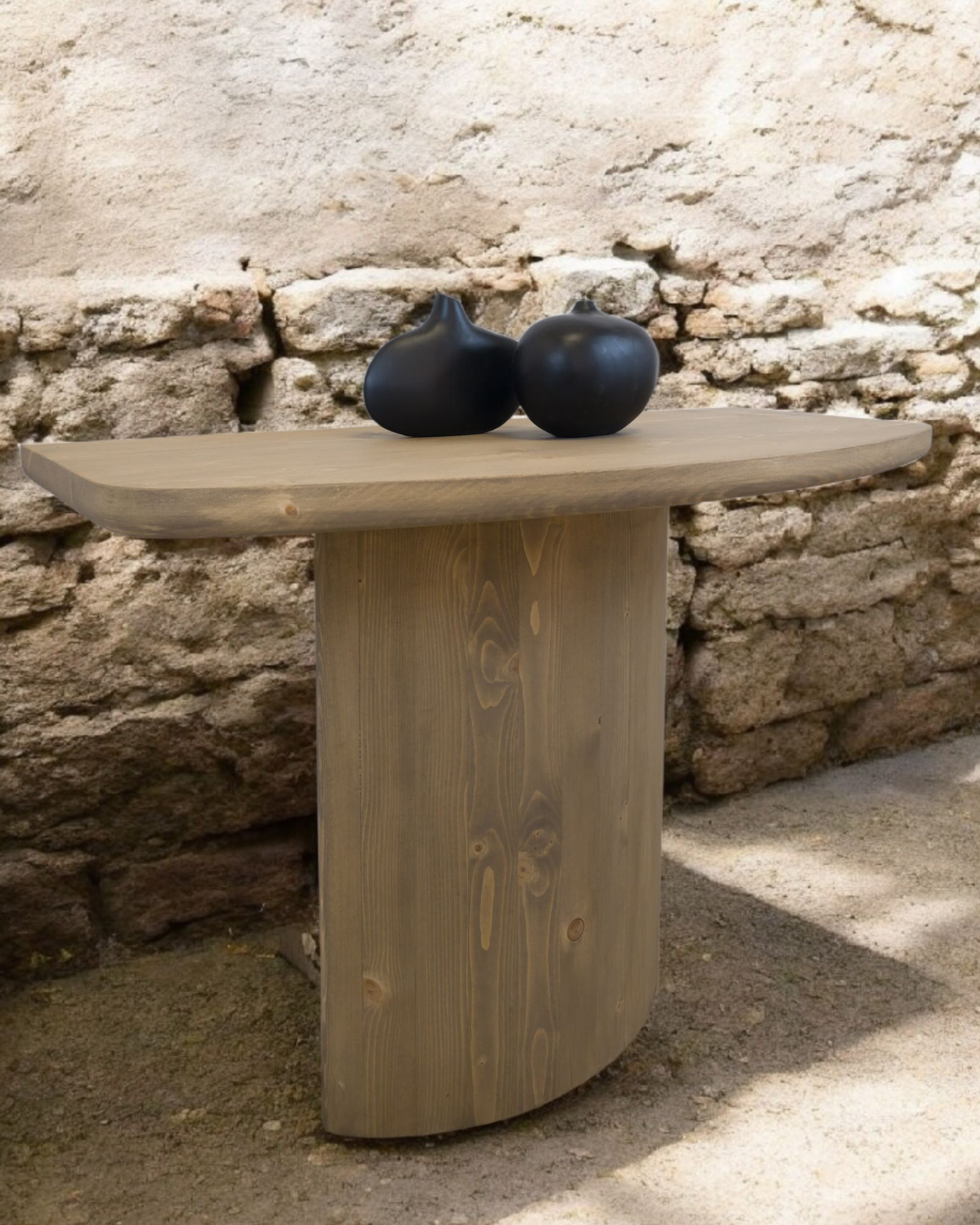 Αυτή η κονσόλα έχει έναν φυσικό, γλυπτικό χαρακτήρα που συνδυάζει τη μασιφ ξυλεία με μινιμαλιστική καθαρότητα. Η επιφάνειά της, με απαλές καμπύλες και οργανική μορφή, μοιάζει να ρέει πάνω στο ενιαίο, οβάλ πόδι της — μια μορφή που αποπνέει σταθερότητα και ηρεμία.