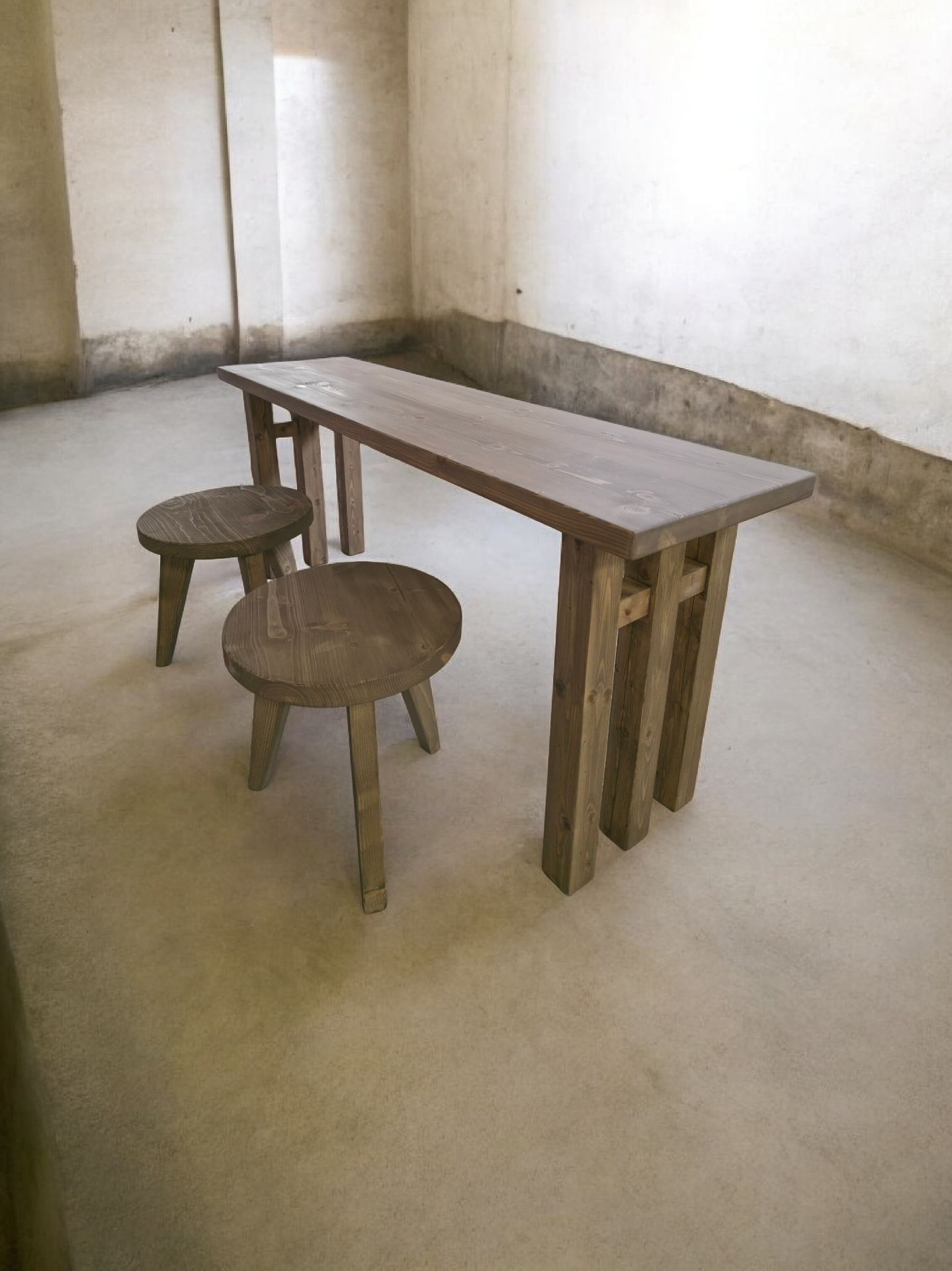 Χειροποίητα σκαμπό από μασίφ ξύλο, σχεδιασμένα να συμπληρώνουν ιδανικά το πάσο και να αντέχουν στον ρυθμό μιας καφετέριας. Στιβαρή κατασκευή, απλές γεωμετρικές φόρμες και φυσική υφή ξύλου που αποπνέει ζεστασιά και αυθεντικότητα.