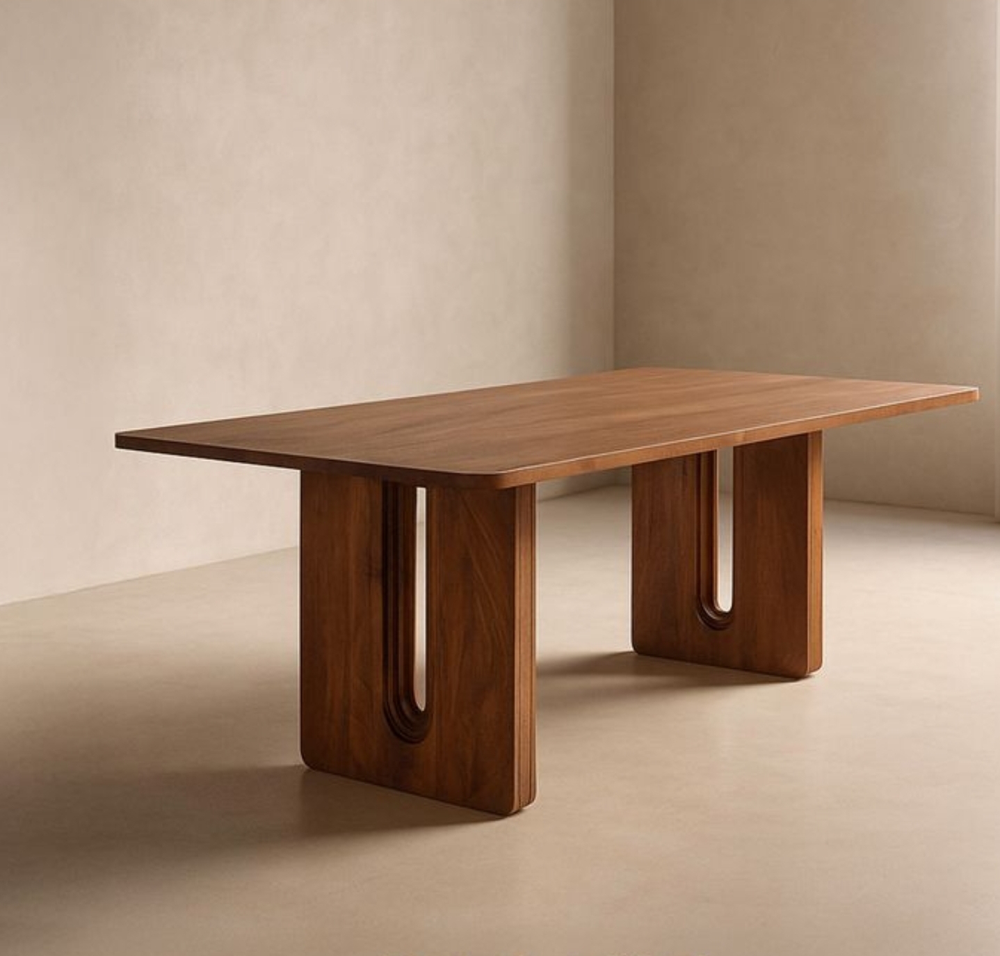 Το ιδιαίτερο στοιχείο της κατασκευής βρίσκεται στη βάση: δύο συμπαγή στηρίγματα με καμπύλη εσωτερική εγκοπή, που δημιουργούν ένα γλυπτικό αποτέλεσμα. Ο σχεδιασμός αυτός δεν είναι μόνο αισθητικά ξεχωριστός, αλλά εξασφαλίζει και εξαιρετική σταθερότητα, ενώ αφήνει άνετο χώρο για τα πόδια.