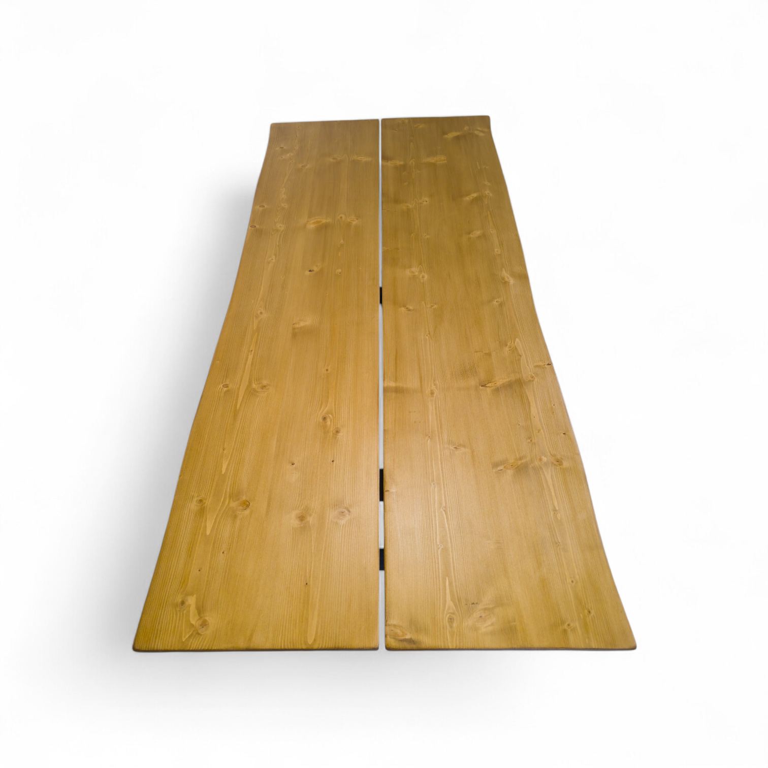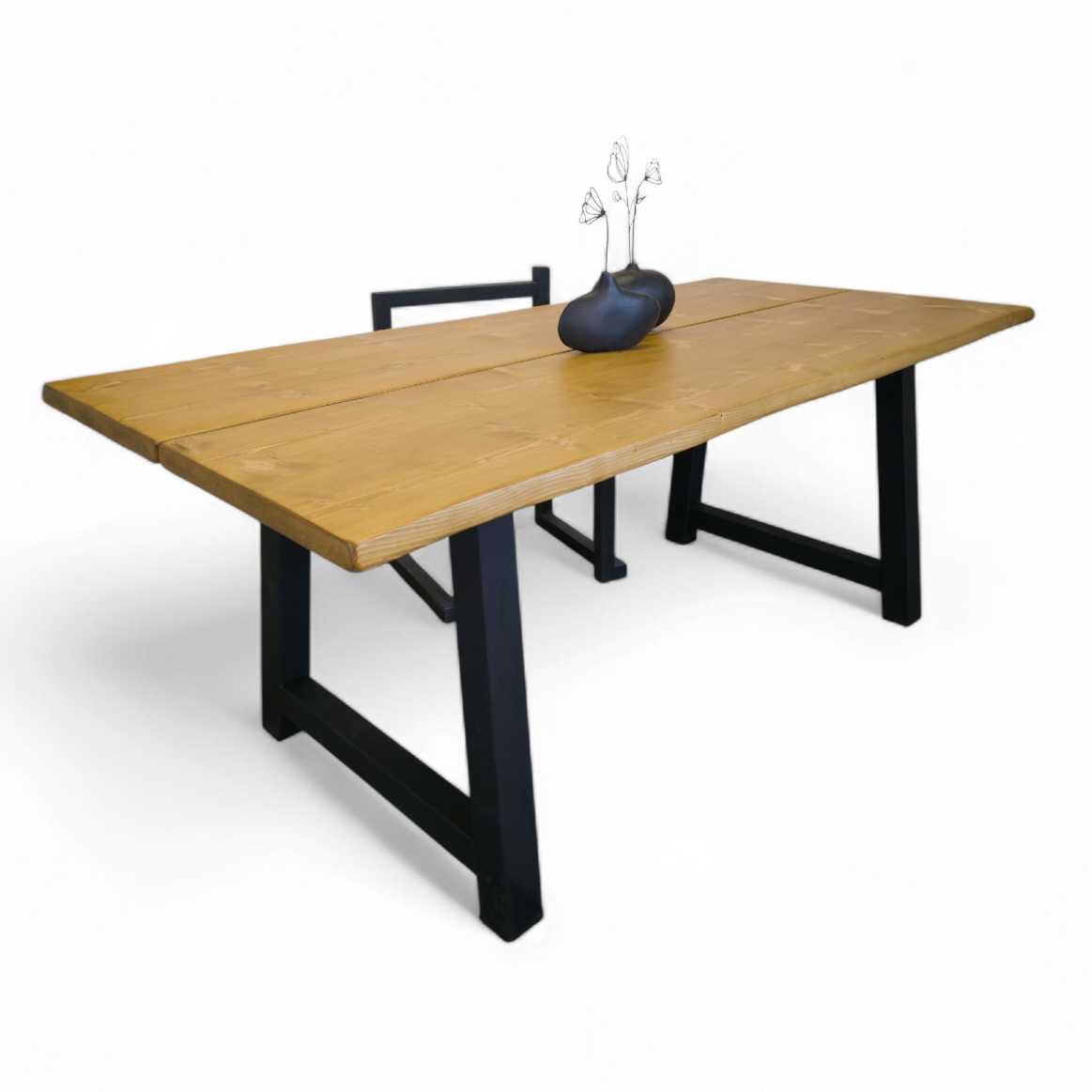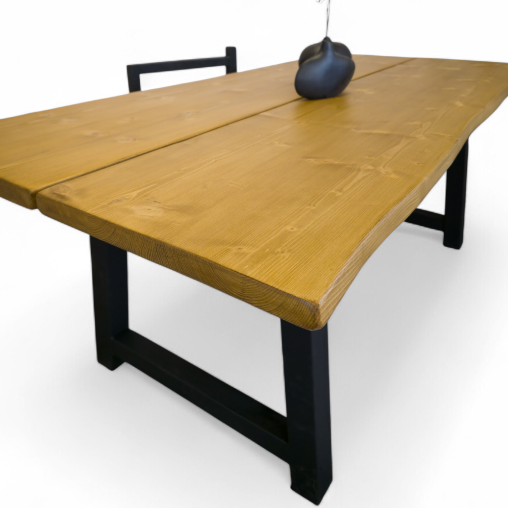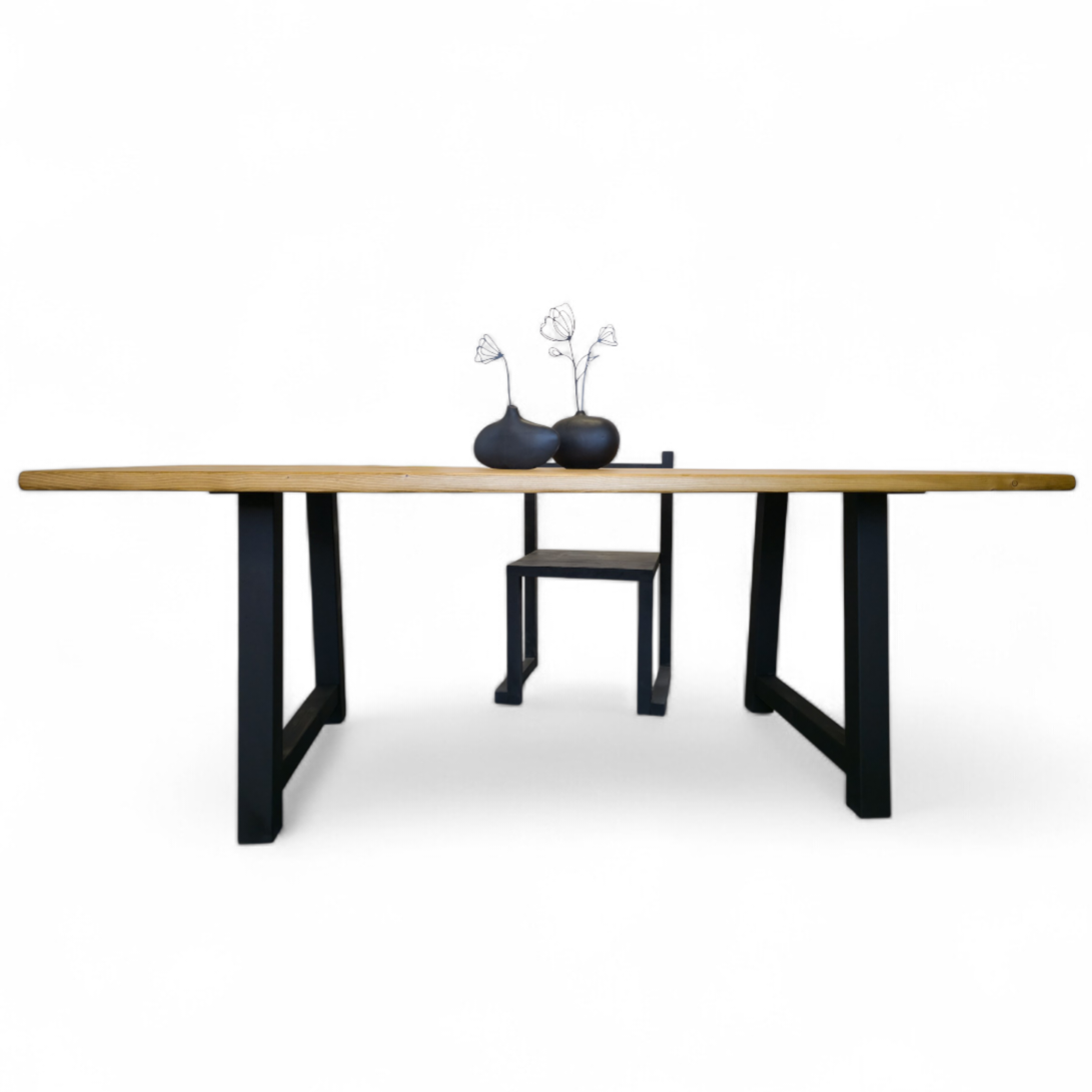 Αυτή η τραπεζαρία συνδυάζει industrial αισθητική με rustic ζεστασιά, δημιουργώντας ένα διαχρονικό statement piece. Η αντίθεση ανάμεσα στις στιβαρές, μαύρες μεταλλικές βάσεις και τη φυσική υφή του ξύλου προσδίδει έναν σύγχρονο, χειροποίητο χαρακτήρα.