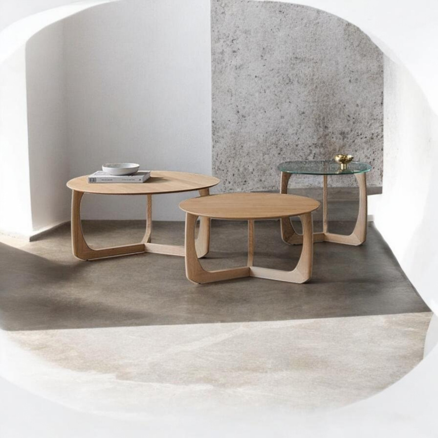 Δυνατότητα Nesting: Σχεδιασμένα σε διαφορετικά ύψη και διαμέτρους, επιτρέπουν τη δημιουργία σύνθετων επιπέδων. Τοποθετήστε τα μαζί για ένα εντυπωσιακό κεντρικό decor ή χωριστά ως βοηθητικά τραπεζάκια.