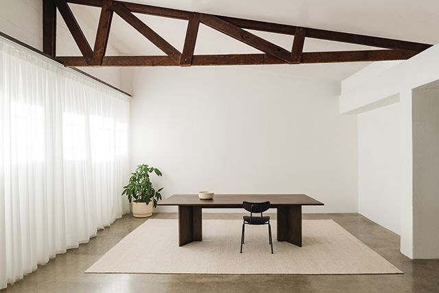 Η τραπεζαρία που φαίνεται στη φωτογραφία έχει έναν εξαιρετικά μινιμαλιστικό και αρχιτεκτονικό σχεδιασμό, με έντονη έμφαση στις καθαρές γραμμές και τον όγκο του ξύλου.