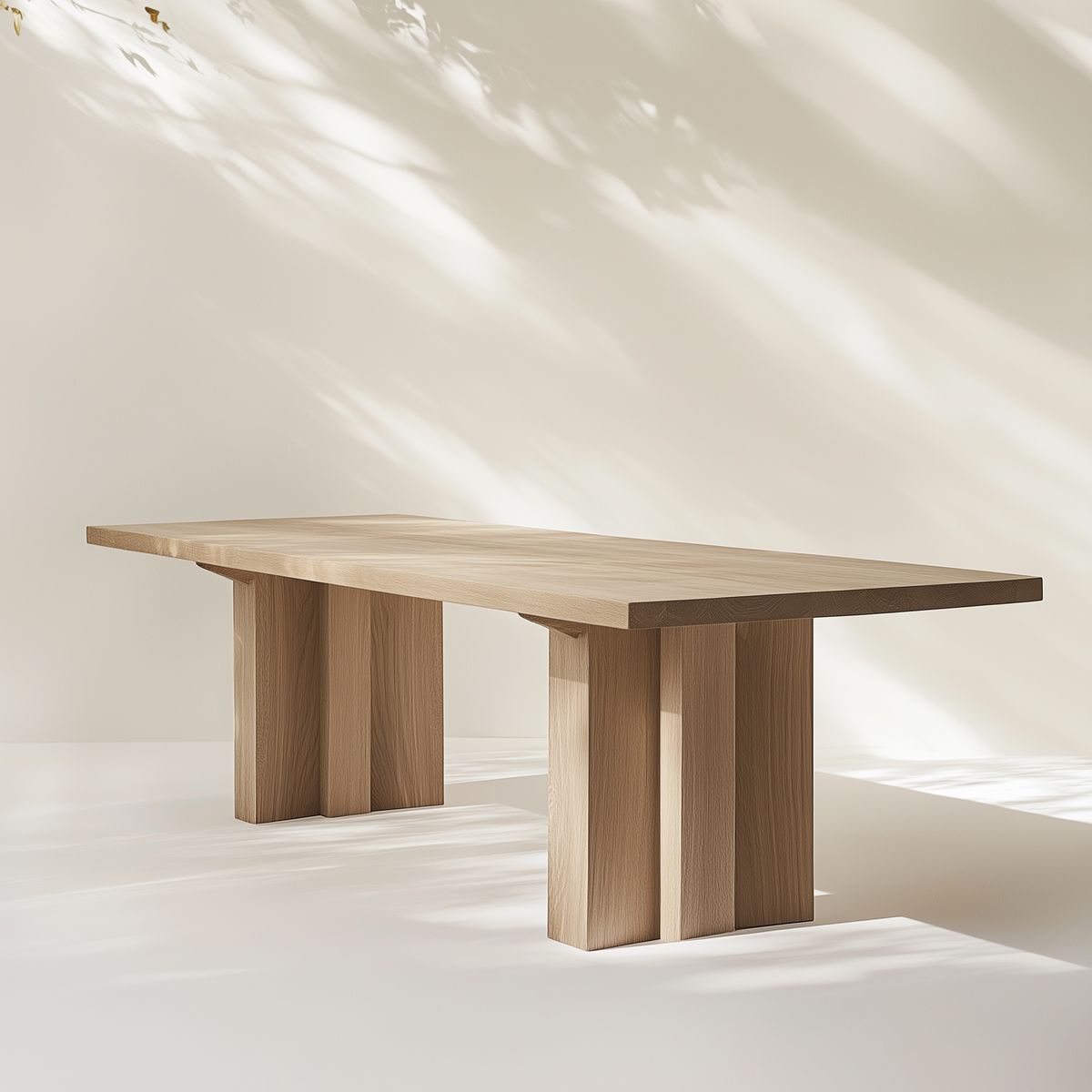 Η επιφάνεια, με τις ζεστές αποχρώσεις του ξύλου, αναπαύεται επάνω σε μια γλυπτική βάση από τρεις κάθετες πλάκες που δημιουργούν μια αίσθηση στιβαρότητας και ηρεμίας. Κάθε στοιχείο είναι μελετημένο ώστε να αποπνέει ισορροπία και αυθεντικότητα, χωρίς περιττές λεπτομέρειες.