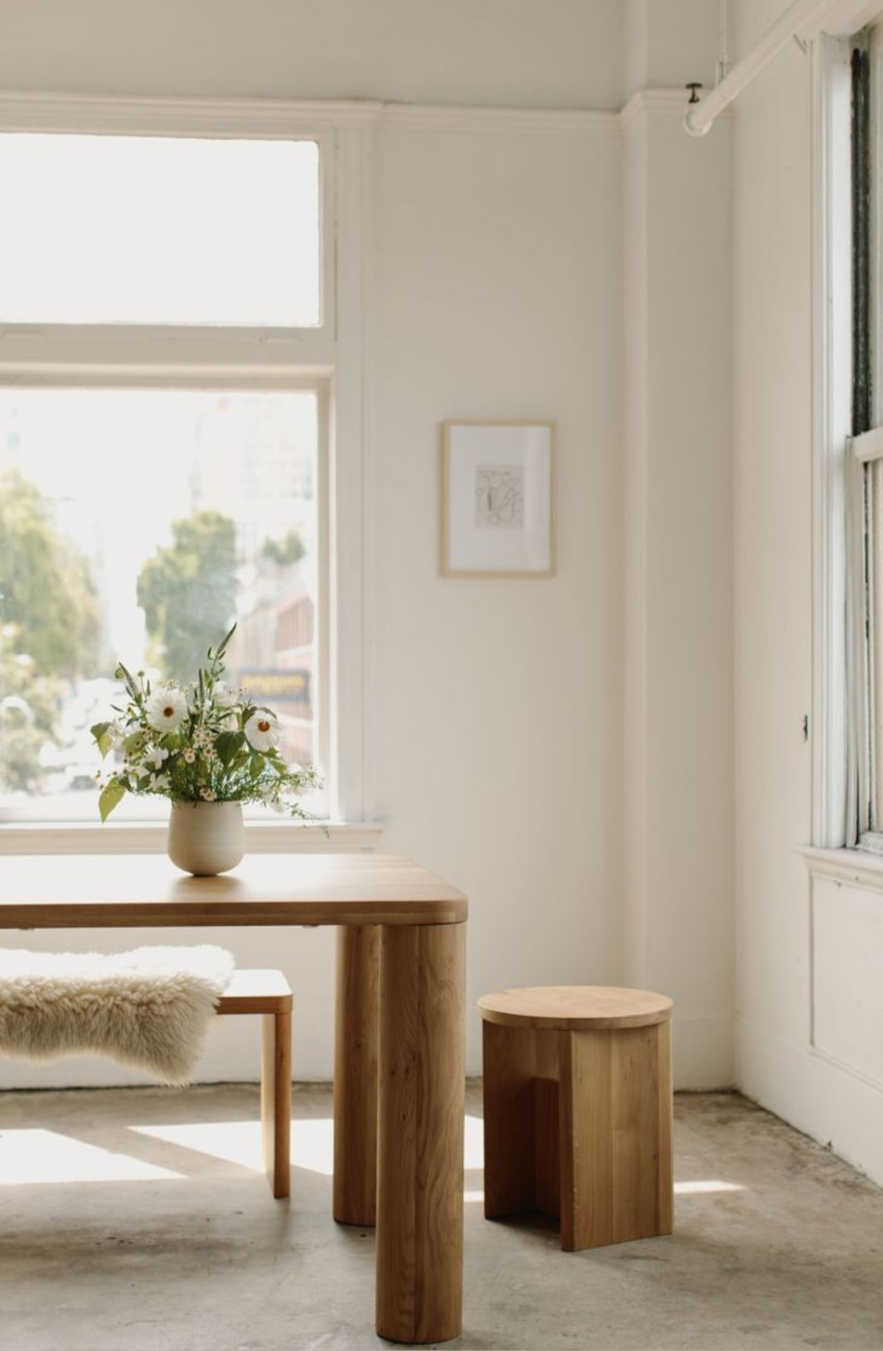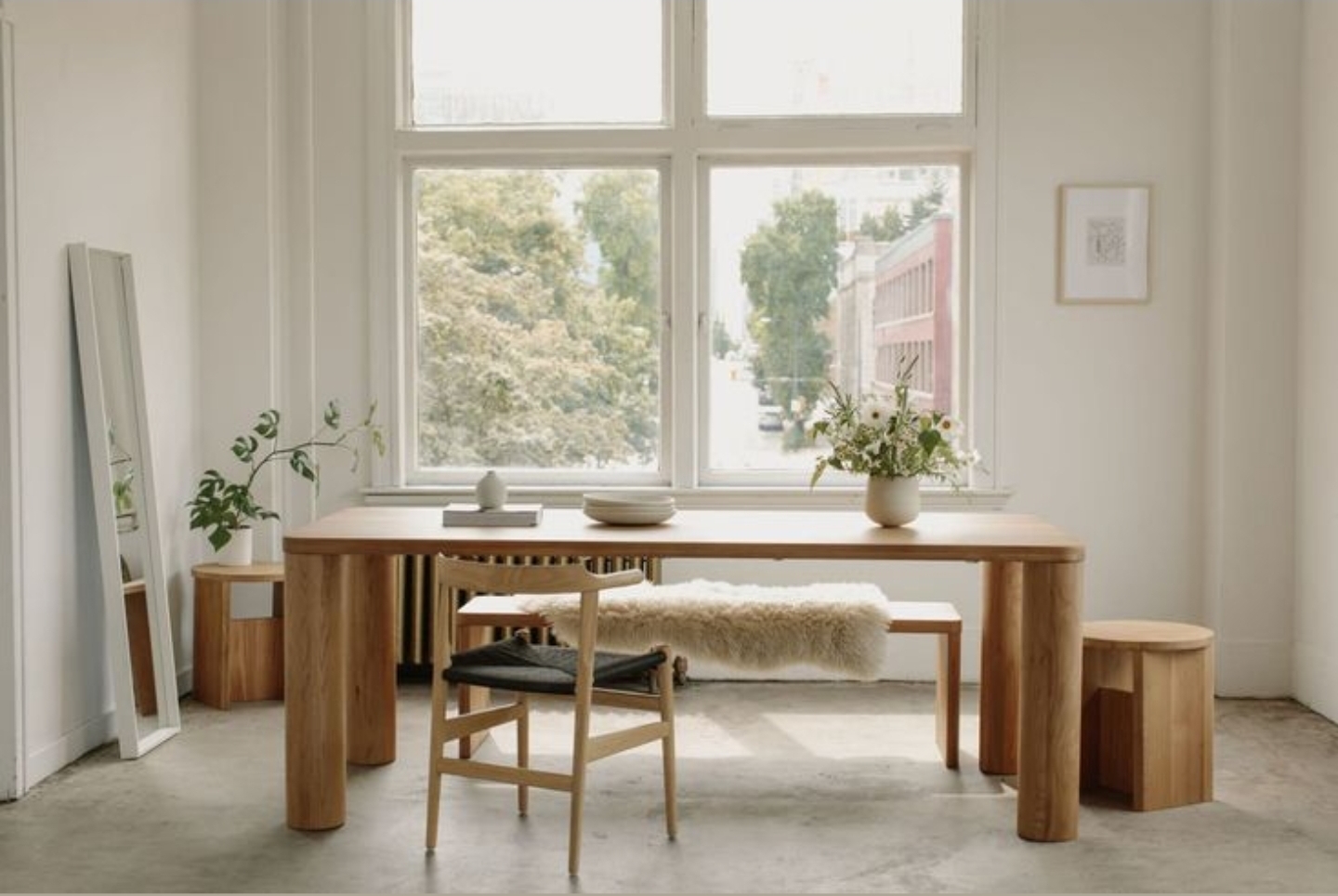Η τραπεζαρία της εικόνας έχει ξεκάθαρη αισθητική minimal–organic με έμφαση στη ζεστασιά του φυσικού ξύλου και την καθαρή γεωμετρία.