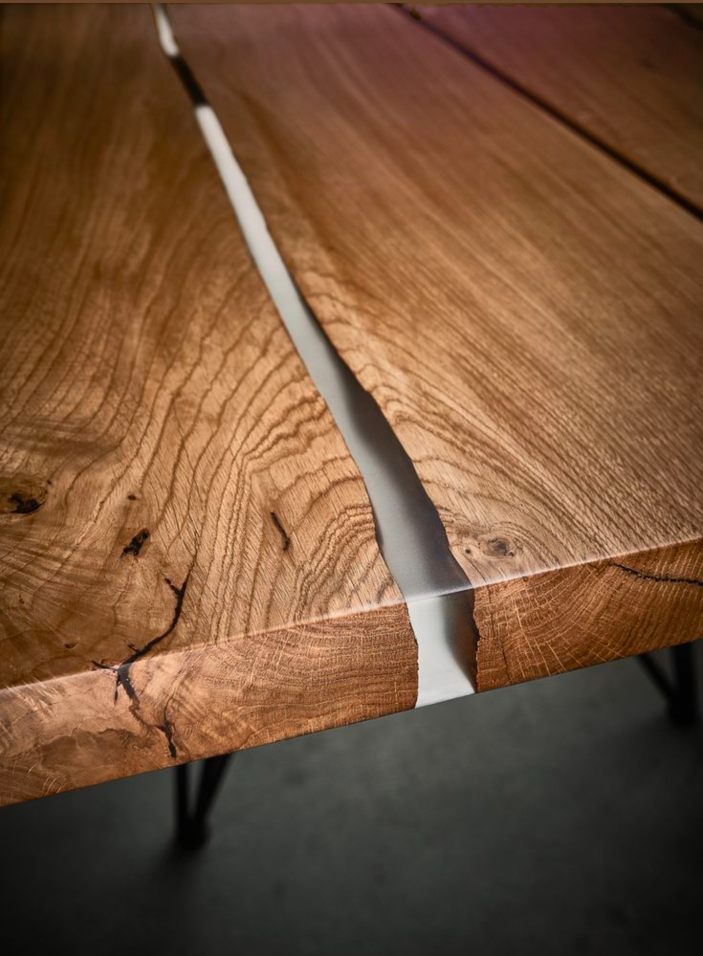 Επιφάνεια μασίφ ξύλου γεμισμένη με υγρό γυαλί (ρητίνη) σε διάφανο ματ φινίρισμα.