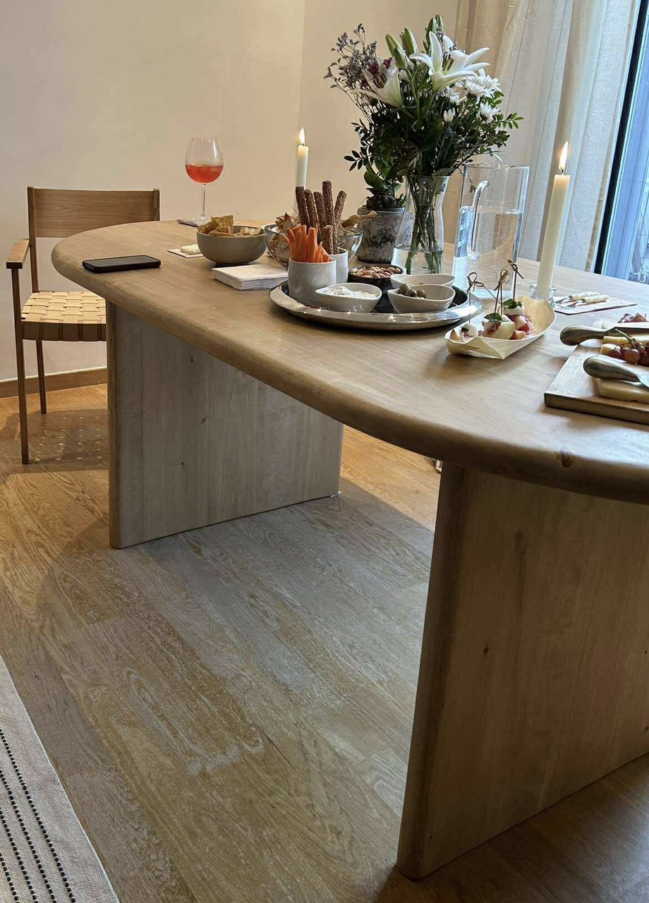 Η "Soft Edge" είναι μια μινιμαλιστική τραπεζαρία με ιδιαίτερα απαλή και οργανική αισθητική. Το design της χαρακτηρίζεται από τις απαλές καμπύλες του καπακιού και τις καμπυλωμένες κάθετες βάσεις, που προσδίδουν μια αίσθηση ροής και ηρεμίας στον χώρο.